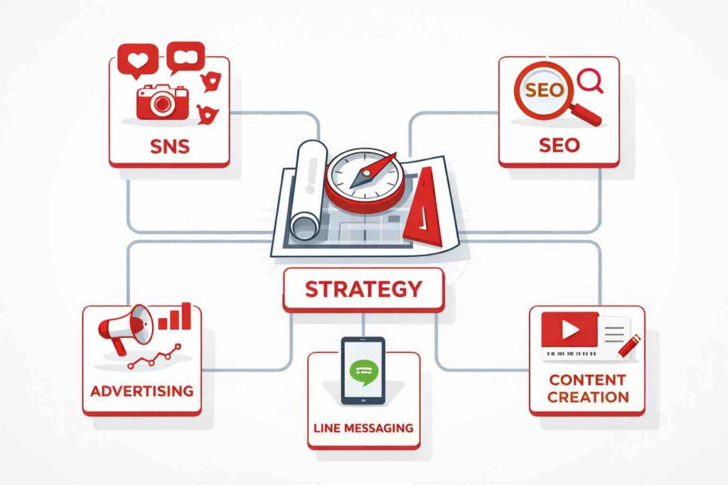 カチプロは、SNS・SEO・広告・コンテンツ・LINEなど、その時の課題に合った施策を優先順位をつけて組み合わせます。部分最適ではなく、集客全体の流れをつなげる支援ができます。